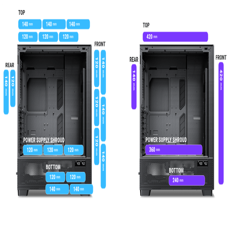 Supports simultaneous installation of 420mm radiator + 360mm radiator.