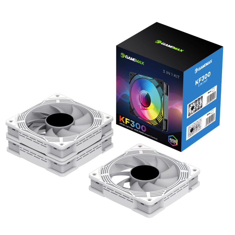 GameMax KF300 WH, 120mm White frame ARGB Fan 3 in 1 Kit, Along Includes Premium V4.0 ARGB HUB with Wireless Remote Controller - High-Performance Cooling Fan for PC Case •【Intelligent Speed Control】3 pcs 120mm full function ARGB PWM fans •The intelligent temperature controls the speed at 800~1600±10% RPM, by linking to the motherboard PWM 4pin socket, so the fan speed auto controlled and keeps the fans quiet •These fans are 3pin 5v ARGB connectors that connect with ARGB control HUB one by one •【Inner And Outer Light】Addressable RGB LEDs can be controlled by ARGB remote controller(Included package), Multiple ARGB light modes and speeds, provide colorful streamer lighting effects •creating a practical and beautiful cooling system •You also can turn on / off the fan light effect and switch the fan hub ARGB signal to the motherboard 5V ARGB port by AURA Sync Mode •【Shockproof Design】The fan frame is fixed on both sides with 8 pieces of shock-absorbing rubber pads •The rubber soft material which is not easy to peel off has a good shock-absorbing effect, which can make the internal operation of the computer case stable and reduce the noise output between the fan and the computer case •The maximum noise of the fan is only 31dBA •【V4.0 ARGB HUB-PWM | 5V ARGB Sync】Remote Control multi-featured hub, Magnetic design for easy installation, the magnet at the bottom of the controller can be firmly attached to the metal plate of the chassis, making installation easy!