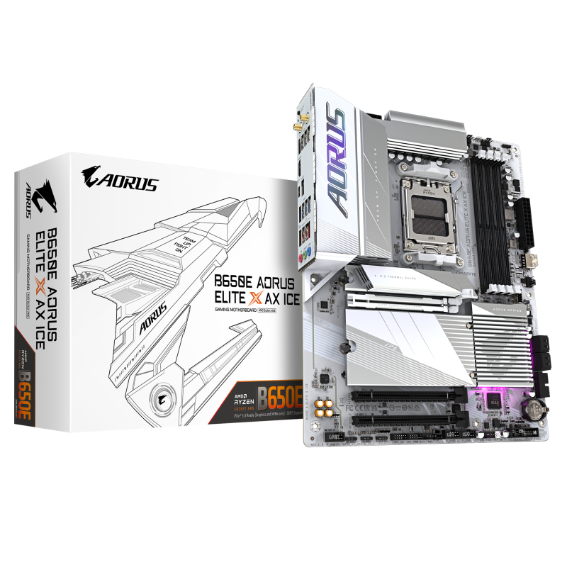 GIGABYTE B650E AORUS ELITE X AX ICE AM5 LGA 1718 AMD B650 ATX Motherboard with 5-Year Warranty, DDR5, 3x M.2, PCIe 5.0, USB 3.2 Gen2X2 Type-C, WiFi 6E, 2.5GbE LAN, Q-Flash Plus, EZ-Latch Plus