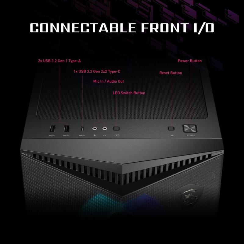 INSTA-LIGHT I/O PANEL - The I/O panel at the front of the top panel includes power & reset buttons, mic/audio jacks, a USB 3.2 Gen 2x2 Type-C (20Gbps) & 2 x USB 3.2 Gen 1 Type-A (5Gbps) ports; The LED switch runs through the ARGB hub for manual control