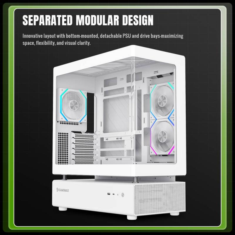 Gamemax N80 White Gaming PC Case — Step into the future of gaming with the Gamemax N80 BK, a perfect fusion of modular design and sleek aesthetics. •Detachable Modular Design: Easily upgrade and customize your setup. •Integrated Curved Glass: Showcase your components with a seamless,stylish front panel. •Panoramic Interior View: Enjoy a full view of your hardware for a satisfying build experience. •Comprehensive Cooling: 270 coverage with 6 ARGB fans for optimal performance. •ARGB Sync: Create custom lighting effects that match your gaming mood. •Vertical GPU Mount: Showcase your graphics card with enhanced cooling and style. •Innovative GameMax Design: Elevate your gaming setup with a bold, eye-catching case.