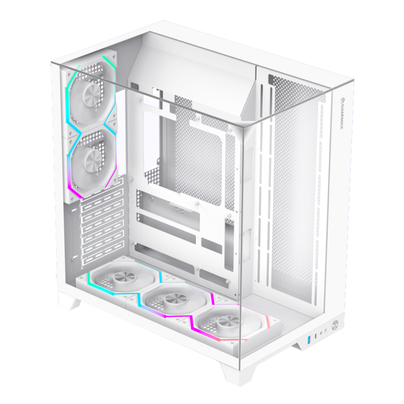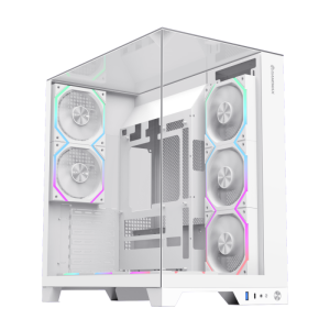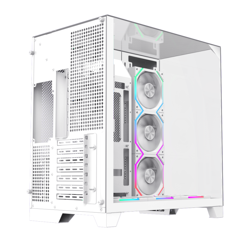 Infinity Pro White Panoramic Tempered Glass Mid-Tower Gaming PC Case •Full-View DesignThe three sides feature tempered glass panels, allowing clear visibility of the RGB lighting and components inside the case, enhancing the overall aesthetics and creating a cool gaming environment. •Superior Cooling PerformanceThe case supports up to 8 RGB fan installation positions (including 2x 120mm fans) and can accommodate various water cooling configurations, ensuring the system maintains optimal temperatures under high load, thus enhancing gaming performance. •Strong CompatibilitySupports ATX, M-ATX, and ITX motherboards, making it suitable for various types of hardware, allowing players to flexibly configure their gaming setups to meet different needs. •Smart I/O Interface DesignEquipped with multiple USB ports (including USB 3.0 and TYPE-C) for convenient device connections, along with audio support to ensure users enjoy the best sound experience during gaming. •Excellent ExpandabilityThe case offers multiple internal storage bays, including 1x 3.5-inch hard drive bay and 3x 2.5-inch SSD bays, making it easy for players to expand their storage space to meet the growing demands of gaming.